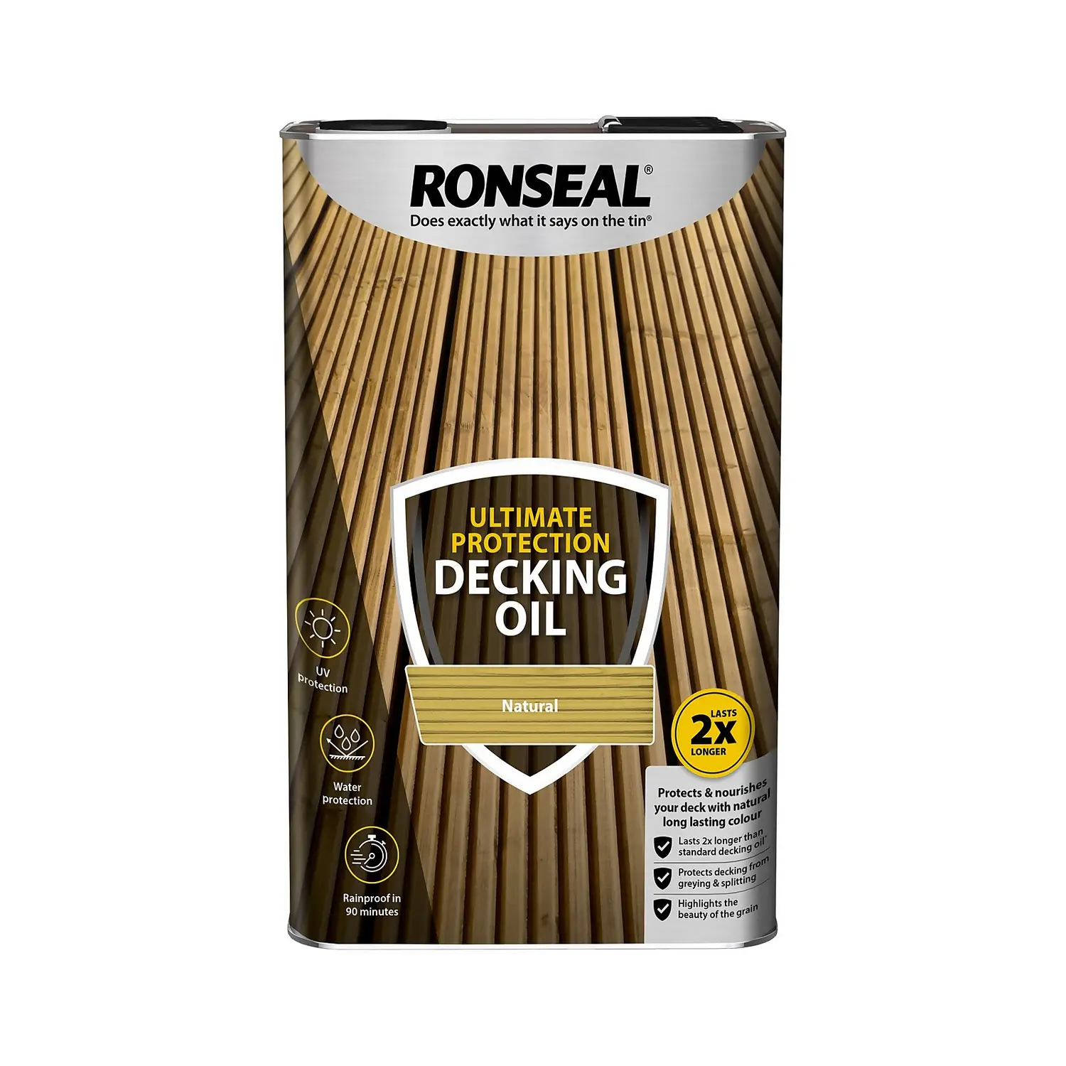 Ronseal Ultimate Protection Decking Oil keeps your deck looking great and protected from the weather. It nourishes deep into your wood to stop it drying out, as well as giving long lasting protection from scuffs and knocks. In fact, it’ll last twice as long as standard decking oil. It’s perfect for new, uncoated decking as well as previously oiled or coated decking.